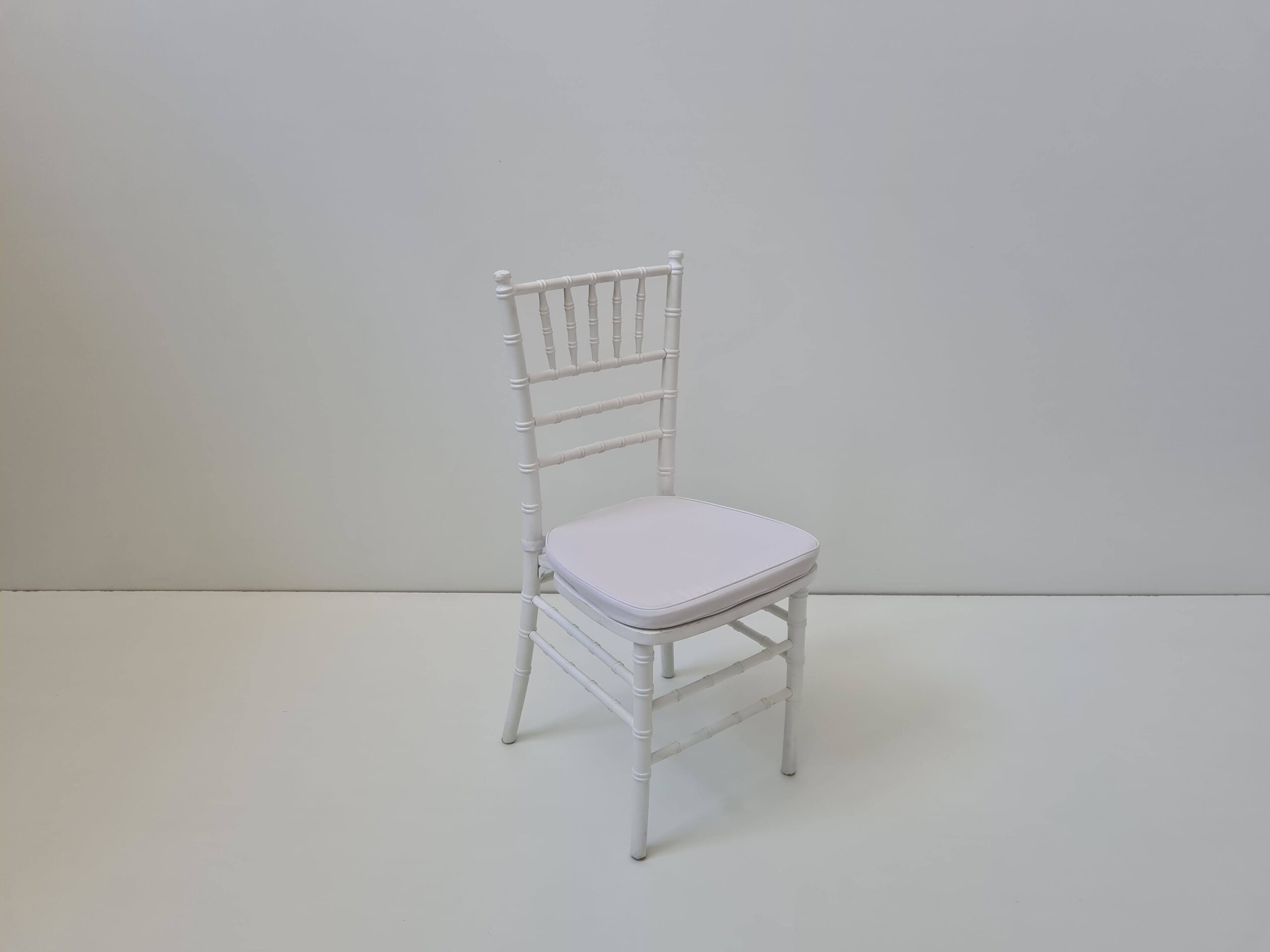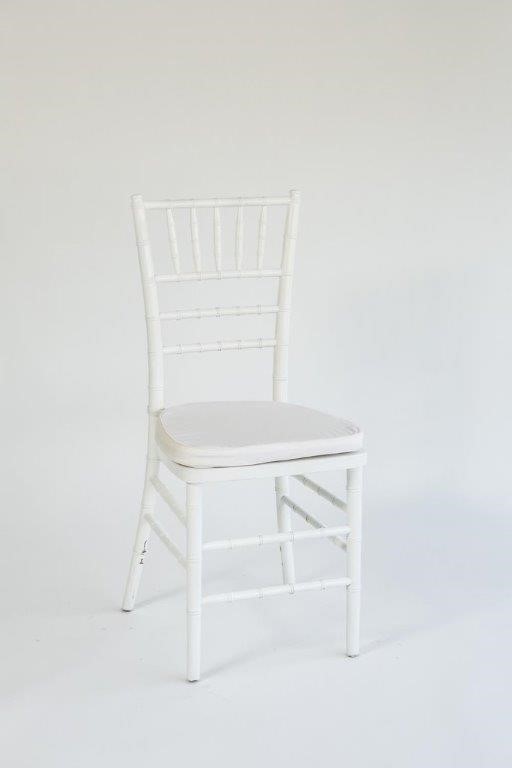| Ξύλινη σταθερή καρέκλα σε άσπρο χρώμα με άσπρο αποσπώμενο μαξιλάρι. |
