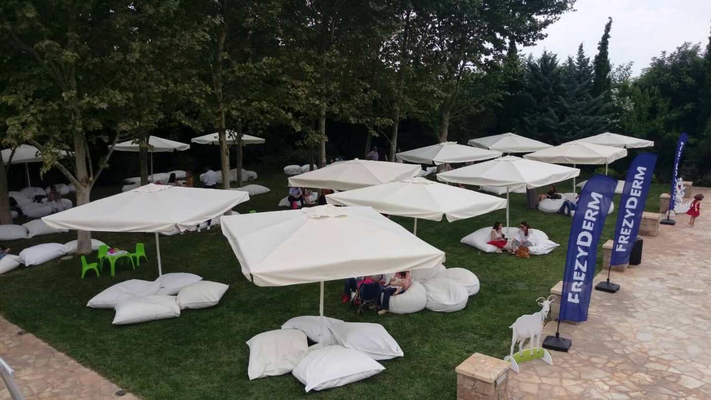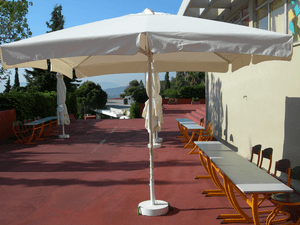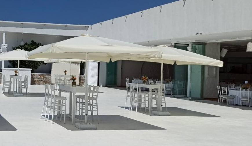 Τετράγωνη ομπρέλλα 3 μ. Χ 3μ. σε λευκό χρώμα. Συνοδεύεται από λευκή βάση 40 κιλών για την στήριξη της.