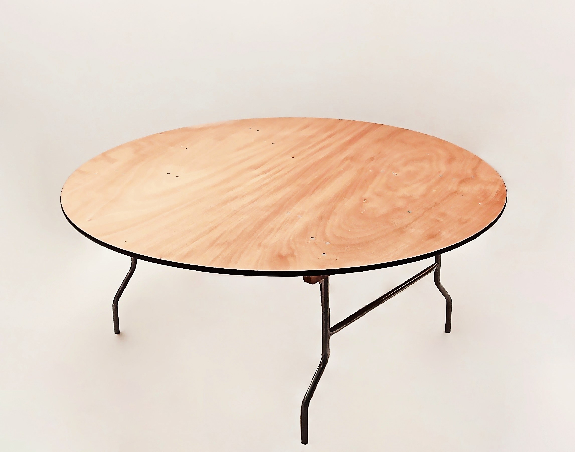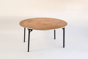 Στρογγυλό ξύλινο τραπέζι με σιδερένιο σκελετό & πόδια που κλείνουν για πιο εύκολη μεταφορά & αποθήκευση.
